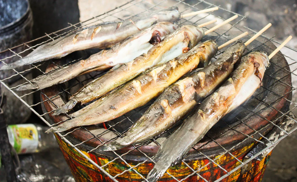 炭焼きによしフライによし。一匹を串にさしたまま売ってくれる。