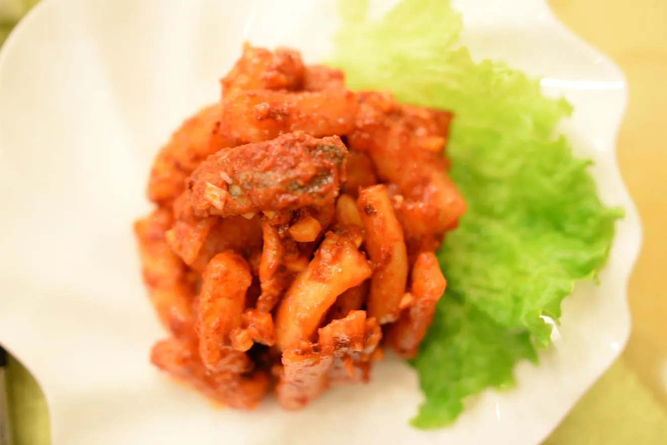 こちらも平壌海棠花(東大橋)の料理。本当はスケソウダラ(明太)の和え物を注文したのだけど、品切れでカジェミならあると言われた。
