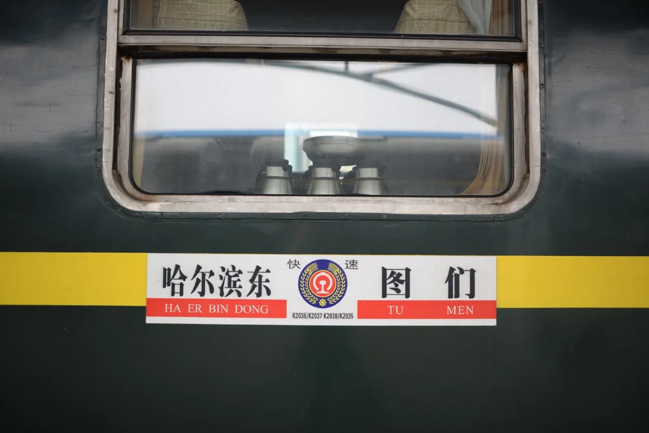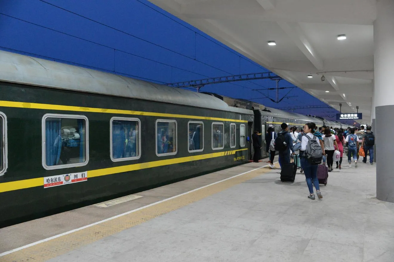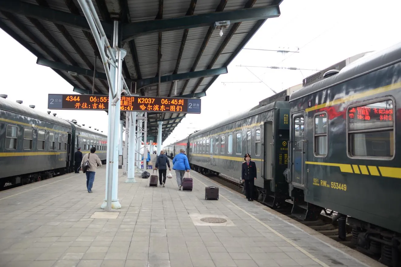 夜のハルピン東駅。みんな客車に乗り込みます。この社会主義国っぽい客車は緑皮車と呼ばれています。