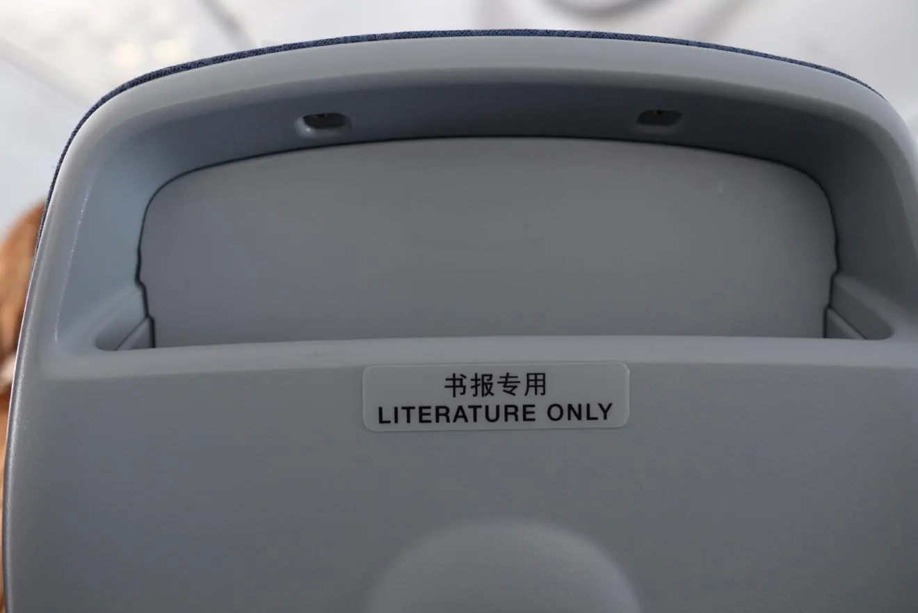 飛行機のシート。英語では「文学のみ」と書いてある。漫画は入れてはいけないのである。