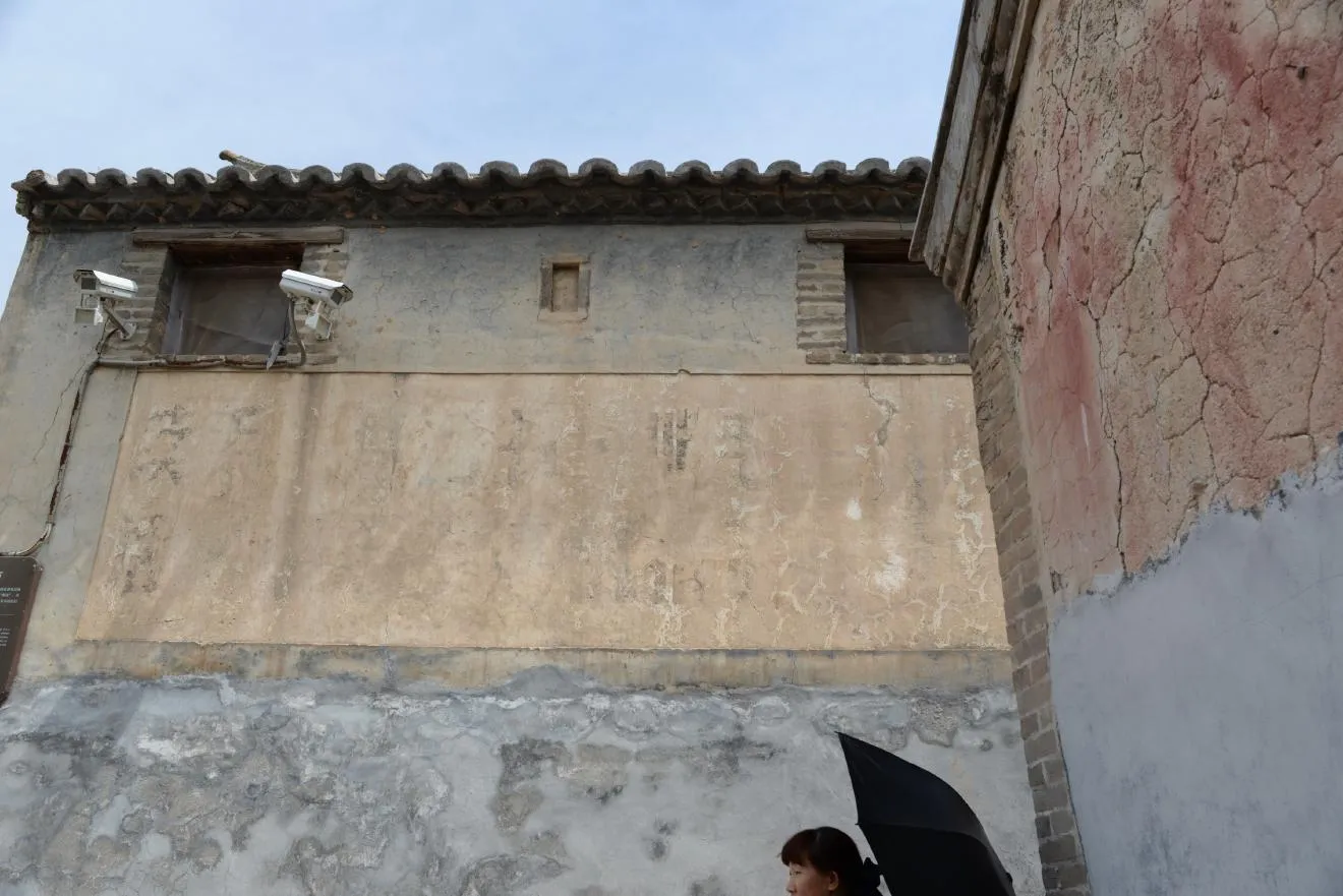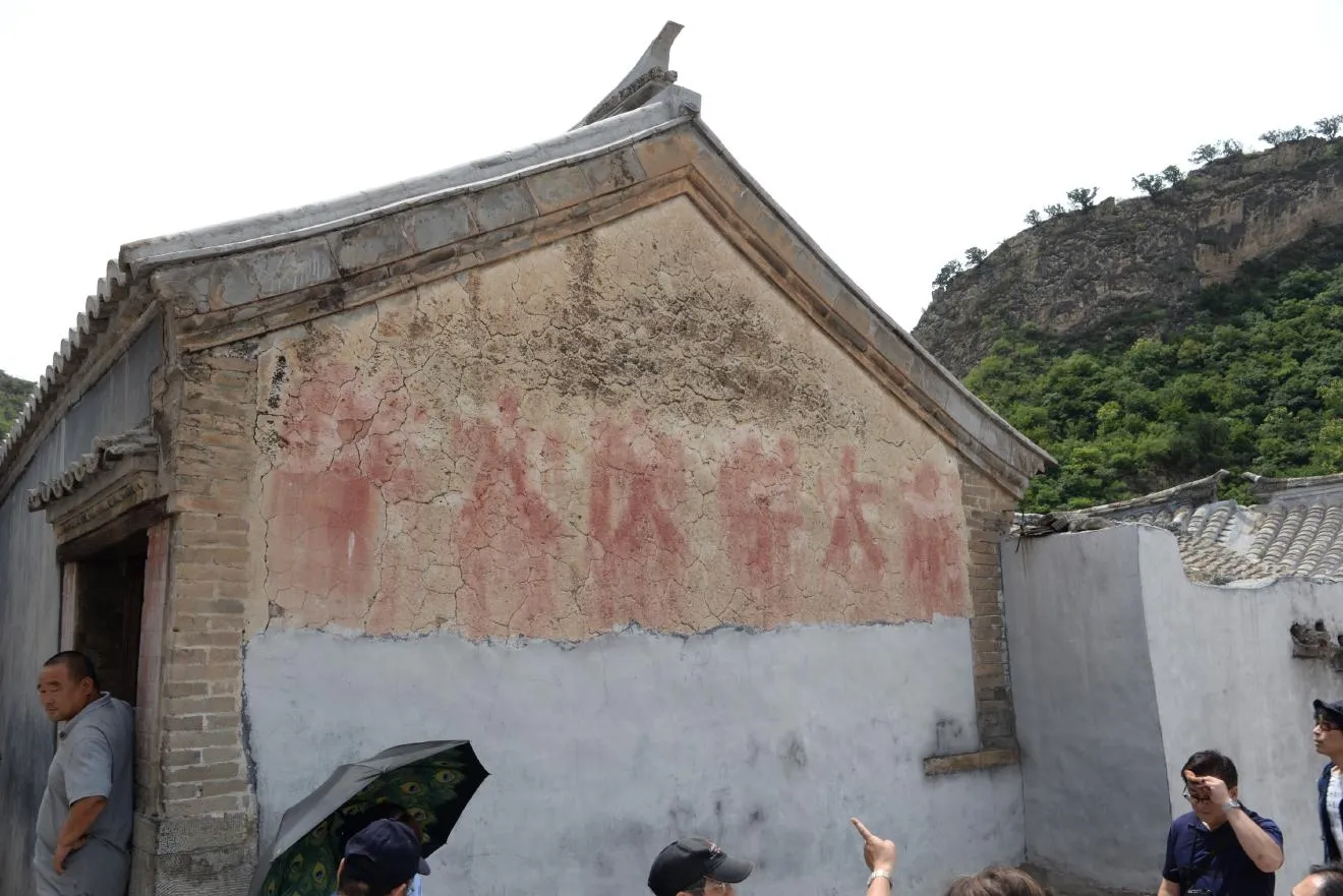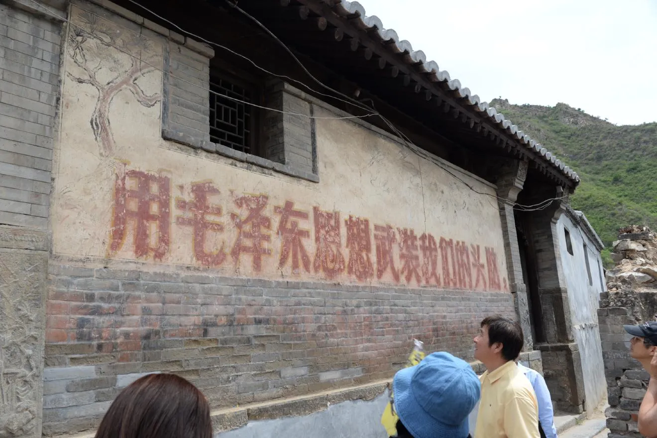 毛沢東思想を用いて我々の頭脳を武装しよう。この壁は上に清のころの壁画、真ん中に文革のころのスローガン、灰色の煉瓦の箇所には日中戦争時代の共産党軍のスローガンが書かれています。
