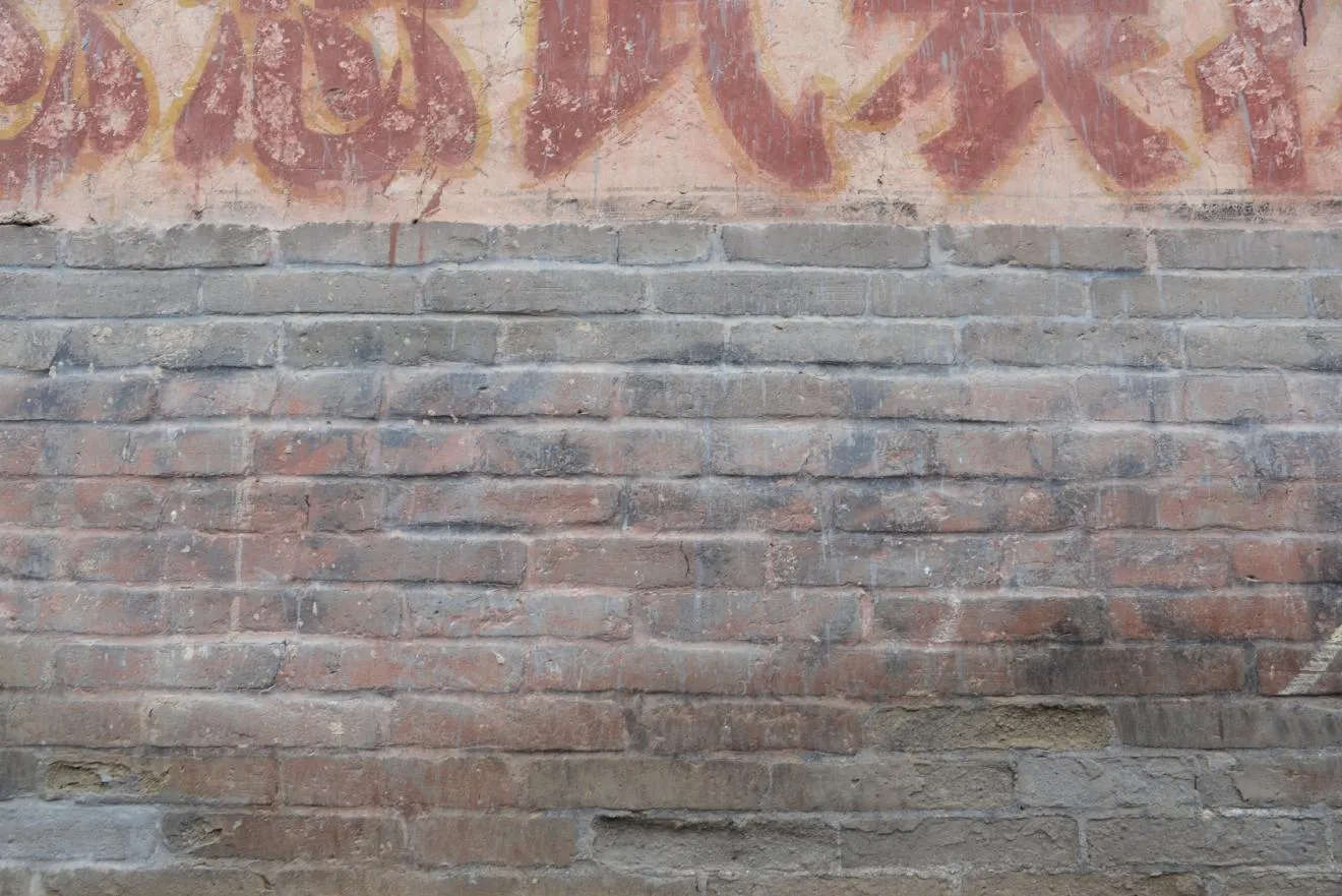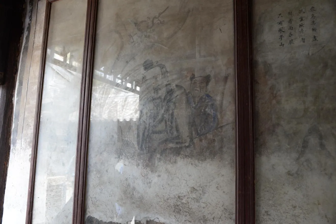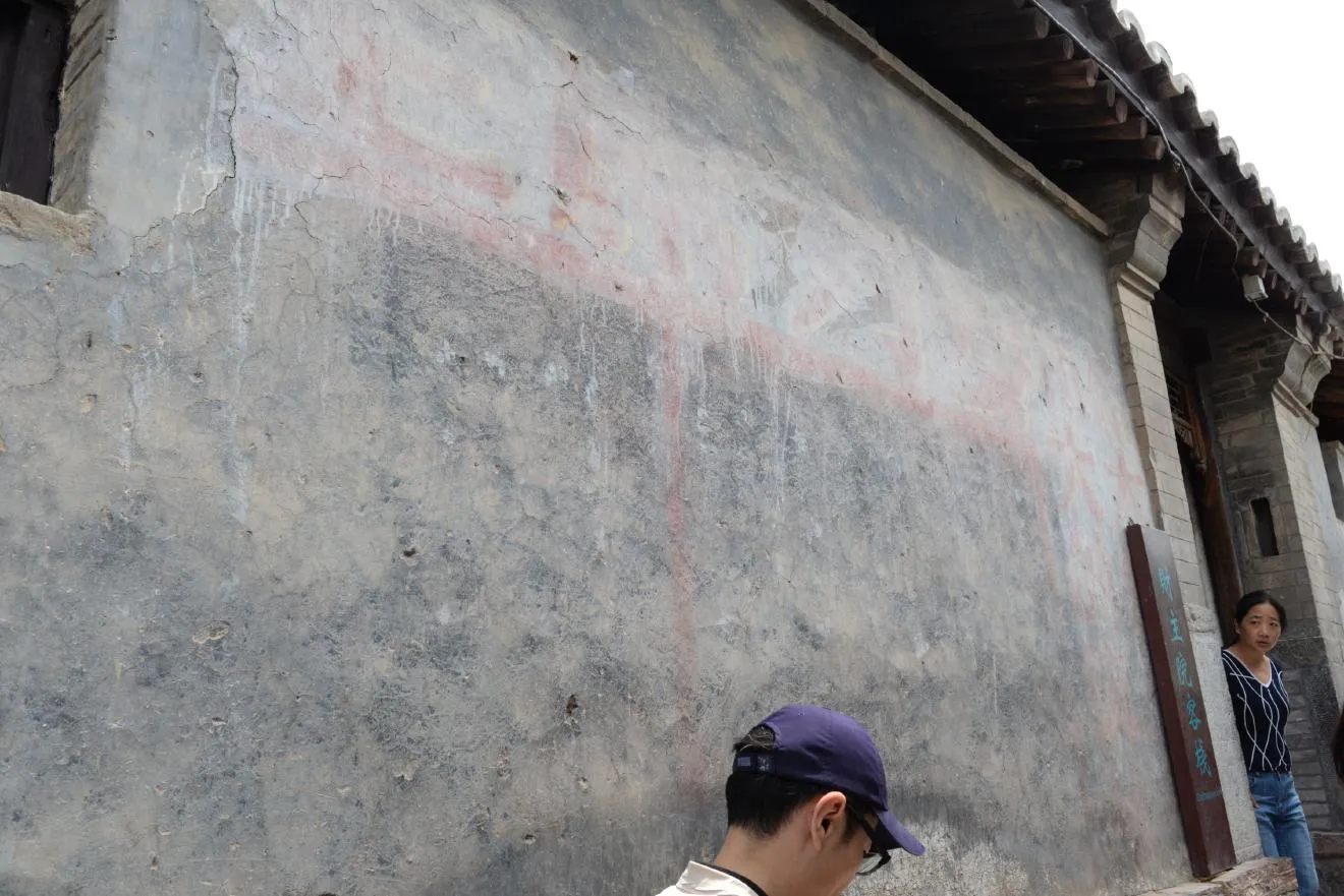 毛沢東思想を用いて我々の頭脳を武装しよう。この壁は上に清のころの壁画、真ん中に文革のころのスローガン、灰色の煉瓦の箇所には日中戦争時代の共産党軍のスローガンが書かれています。