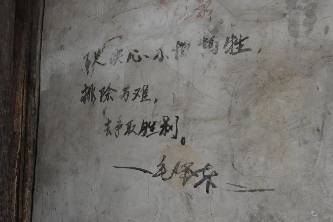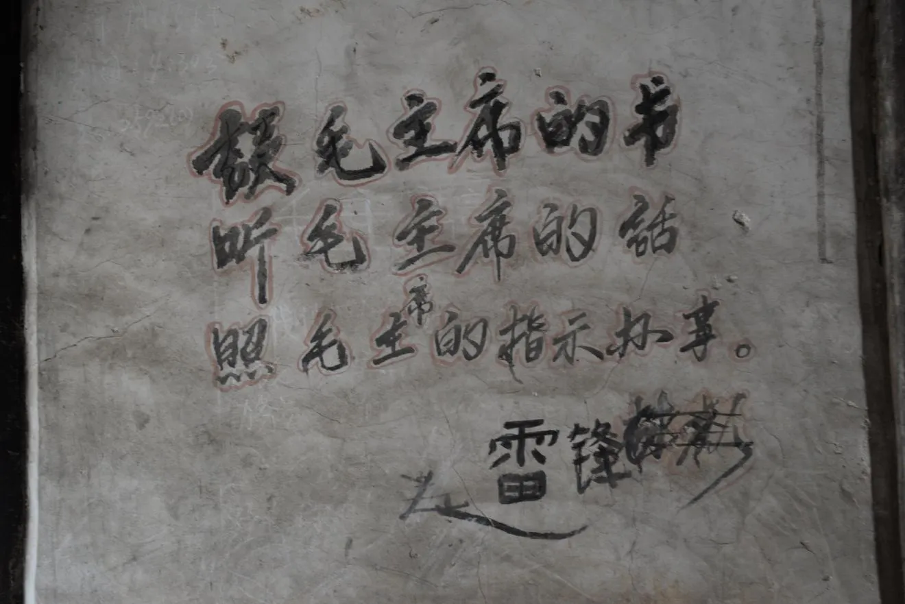 ある扉の後ろの壁にもスローガンがありました。こちらは林彪の名前が消されて、雷鋒同志の名前に書き換えられていました。