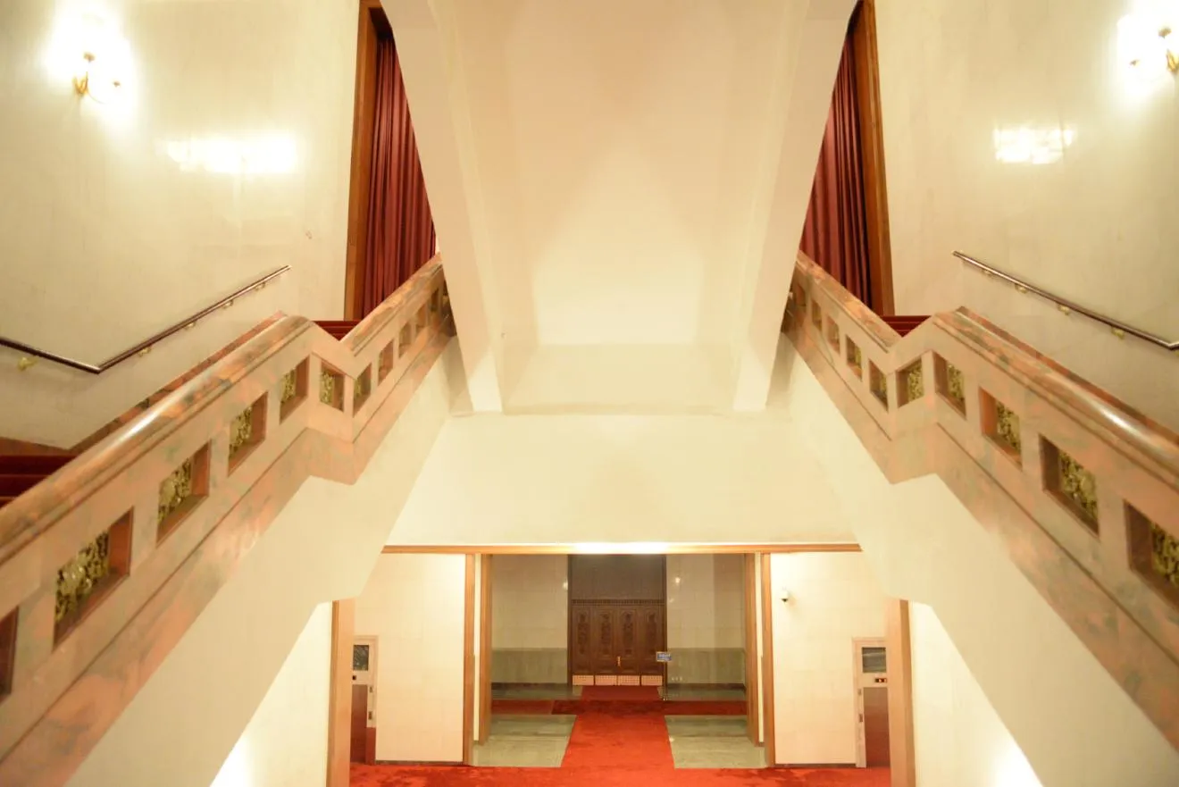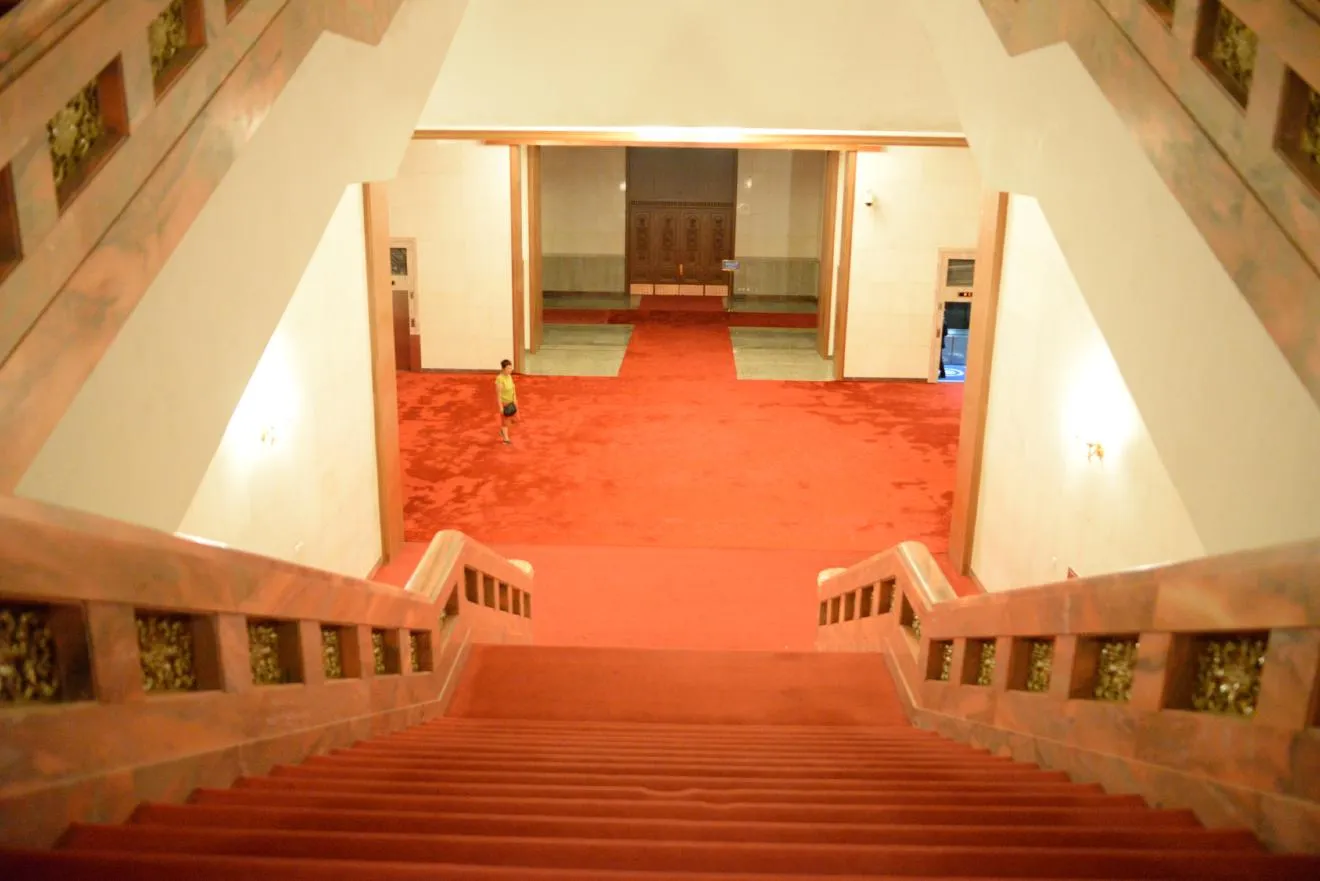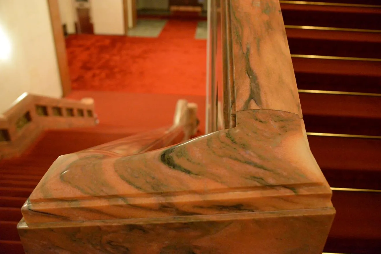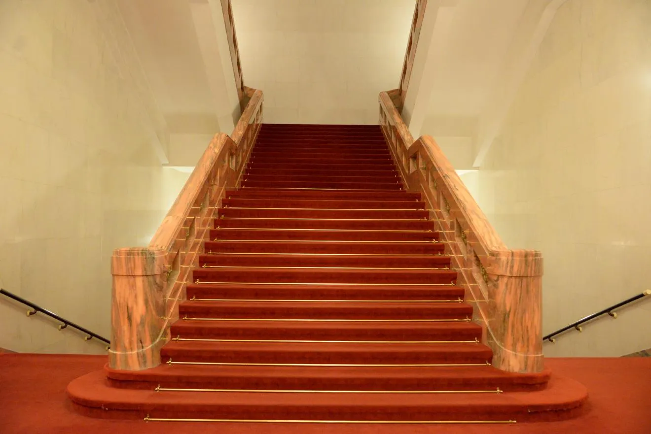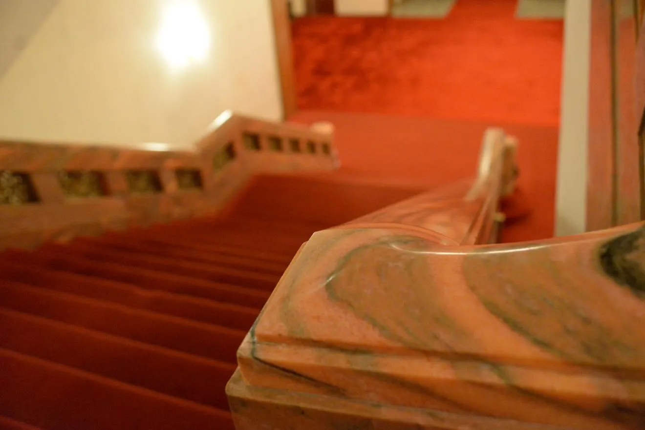 こちらが階段。手すりも絨毯も赤系で統一されています。