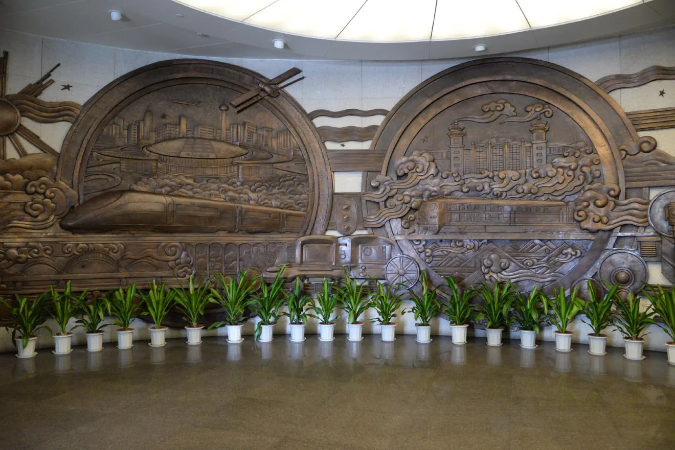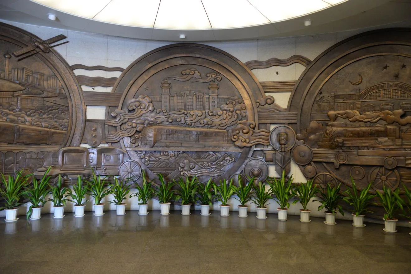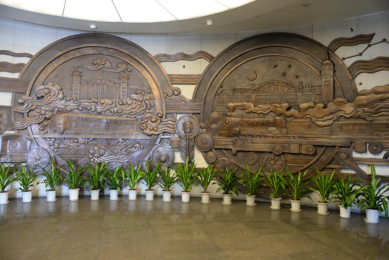 入ると大きなレリーフが迎え入れてくれます。左から蒸気機関車、電車、高速鉄道が描かれています。後ろの駅舎の様子もあって、時代とともに発展の様子がわかりますね。