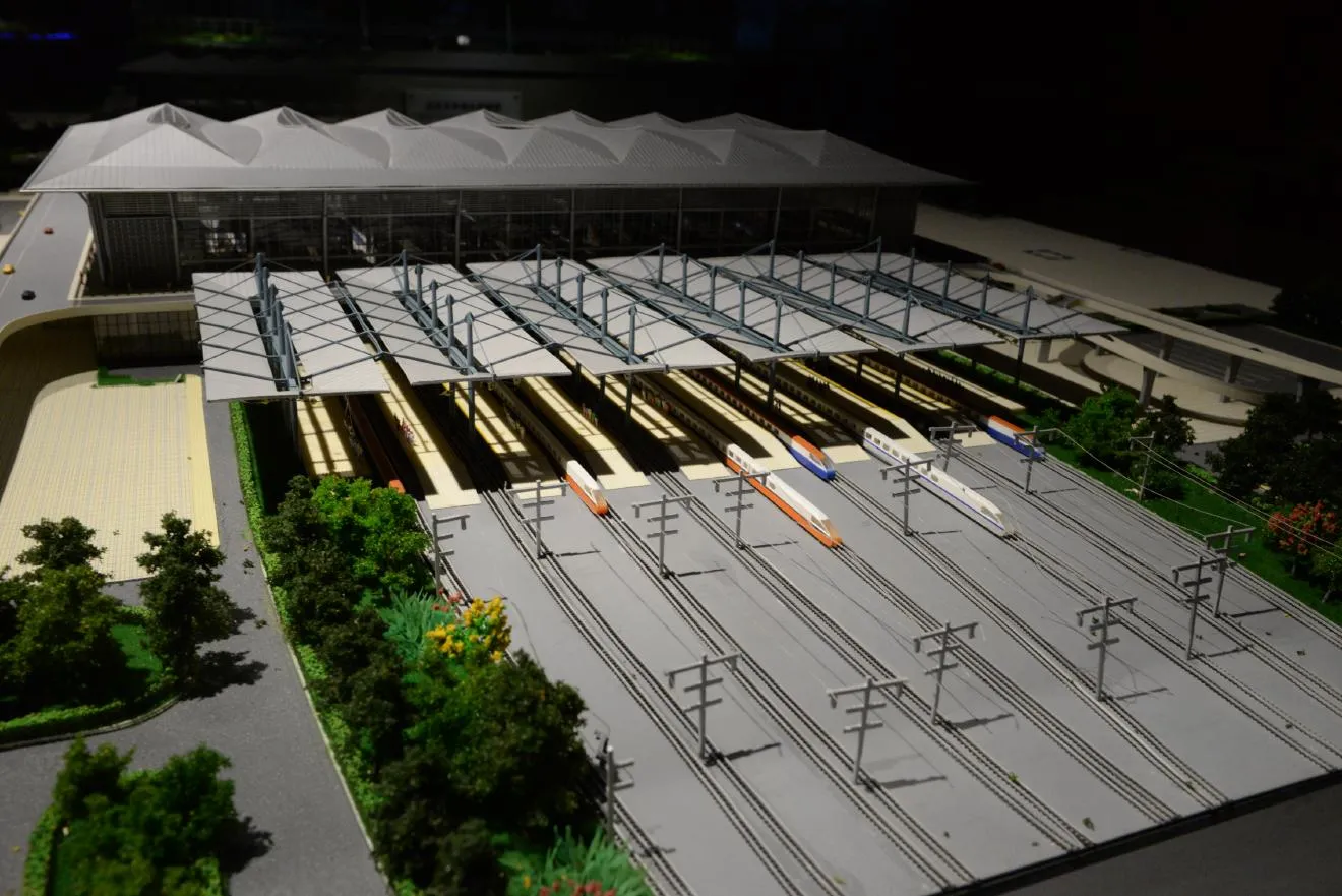 10分の1の模型があります。無蓋貨者と高速鉄道が並走しています。