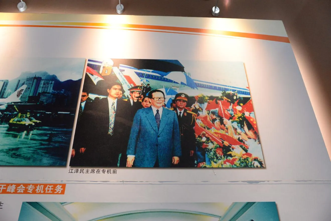 飛行機の前の江沢民主席。