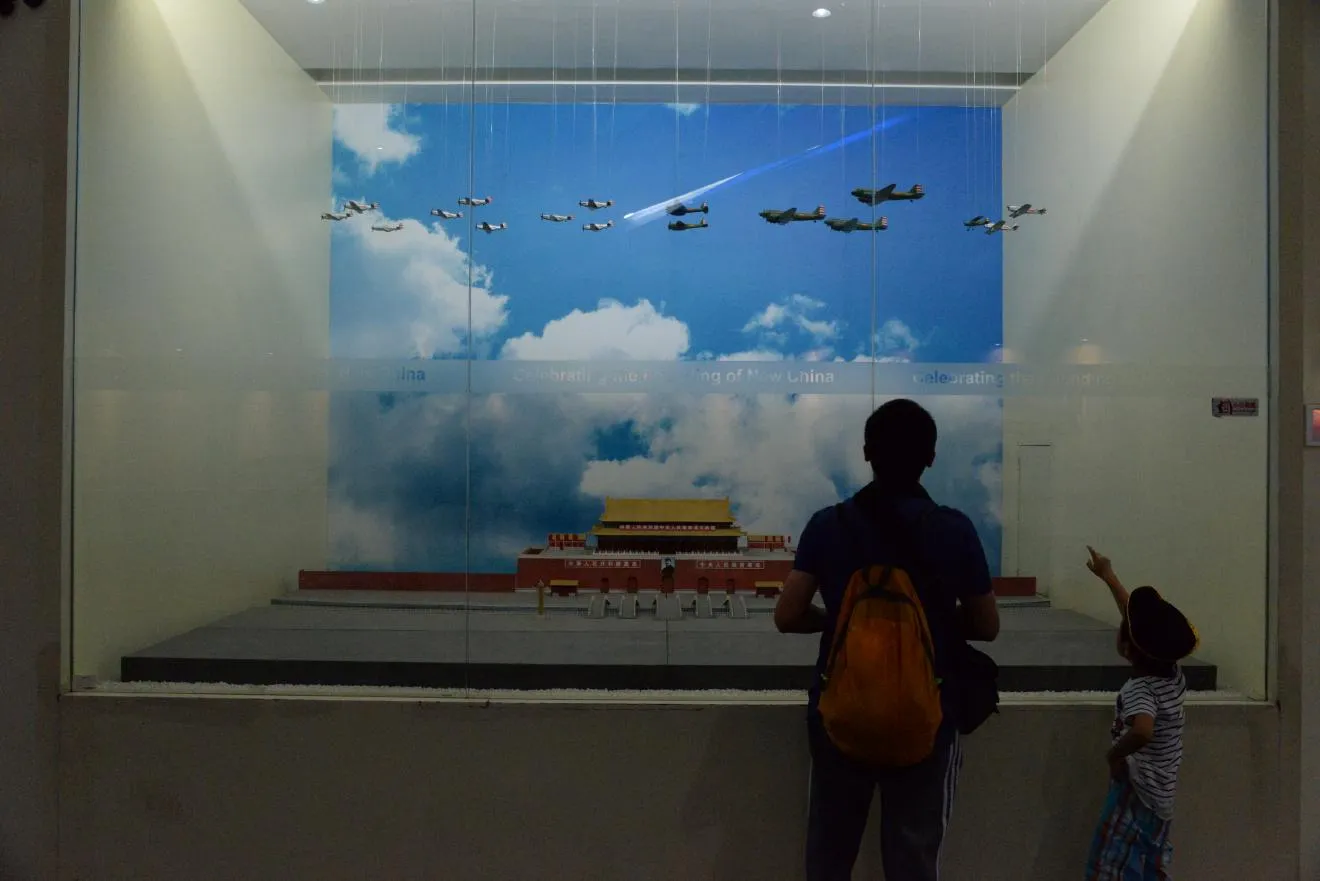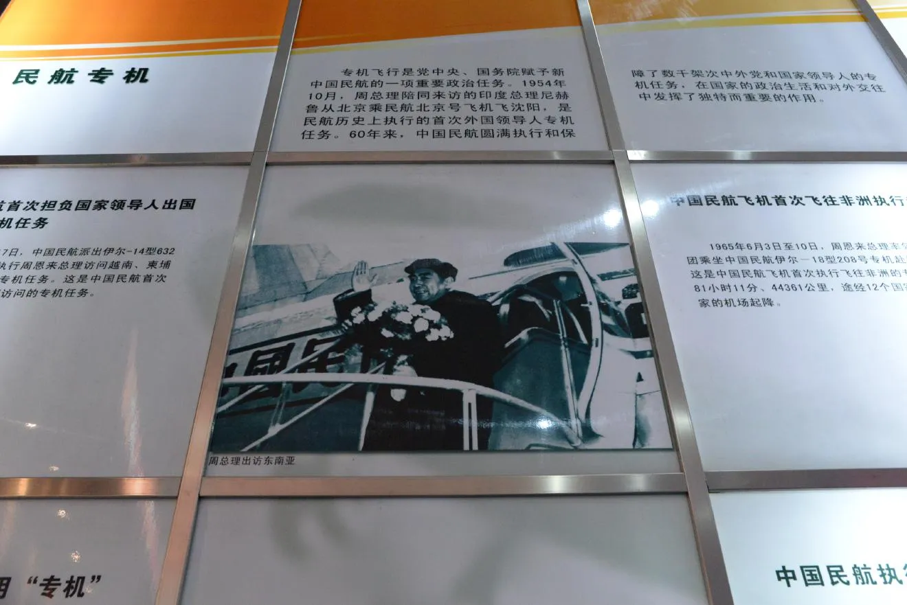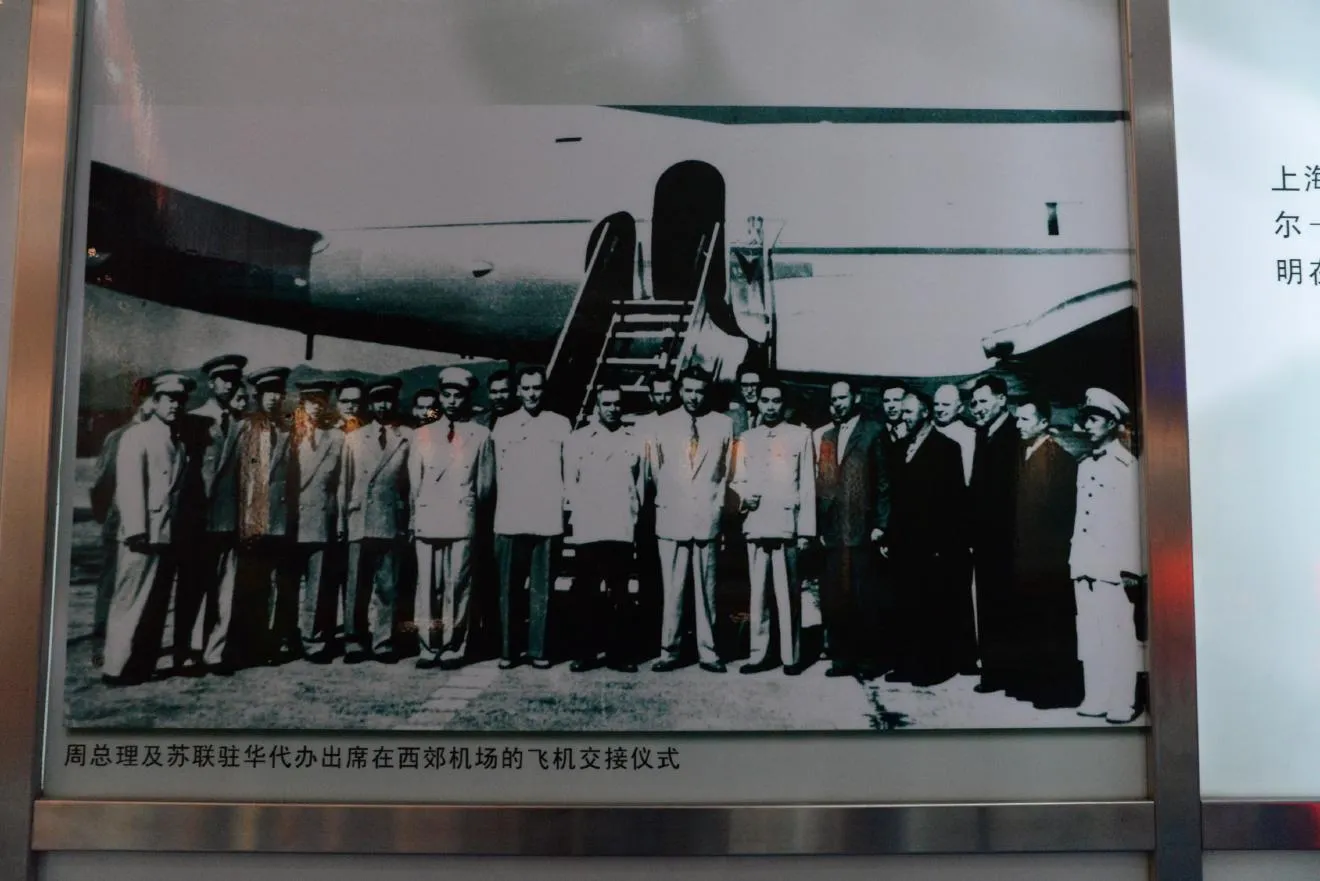 周恩来総理と在中国ソビエト代表が西郊飛行場で飛行機の受け渡し式を行った様子です。西郊飛行場は現在も軍用飛行場として活用されています。
