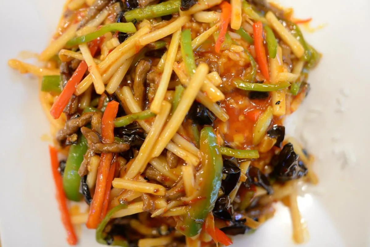 細く切ったブタと野菜をいためて、甘酢をかけたもの。